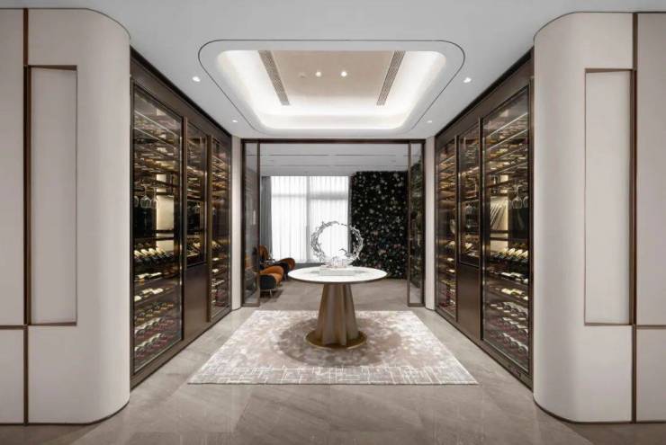 更多的人都是开车回家,地下大堂和地面大堂同等重要,下楼来到地库,星光顶大堂,层高很舒适,是永生苔藓的绿意盎然,墙面岩板,吊顶铝板,还用石材包柱内嵌水晶灯柱,这样的配置在2万+大平层中极为罕见。