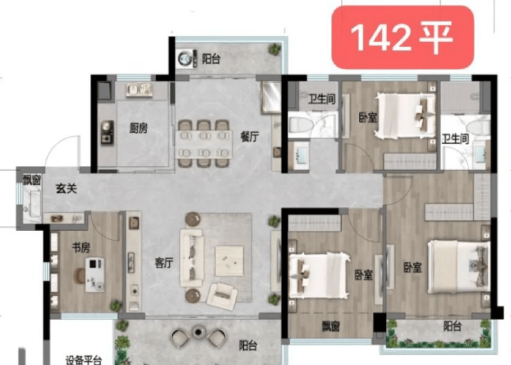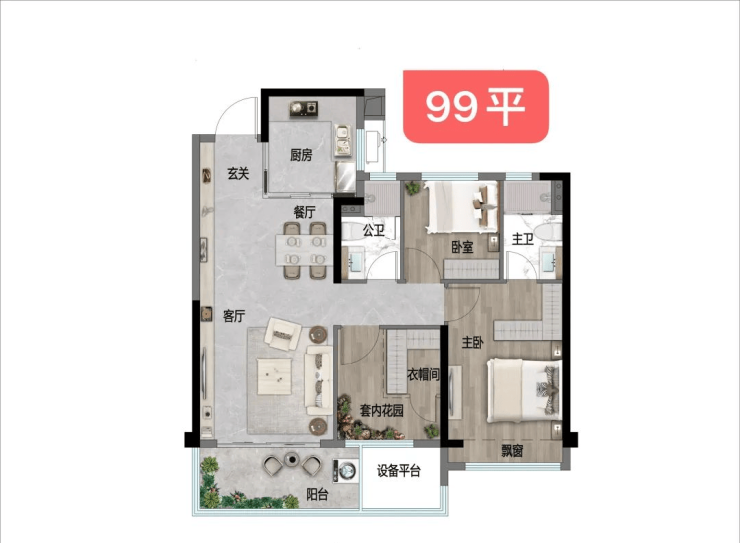 主力户型96-173㎡,得房率高,三开间朝南,部分户型带270°环幕视野、地暖及新风系统。