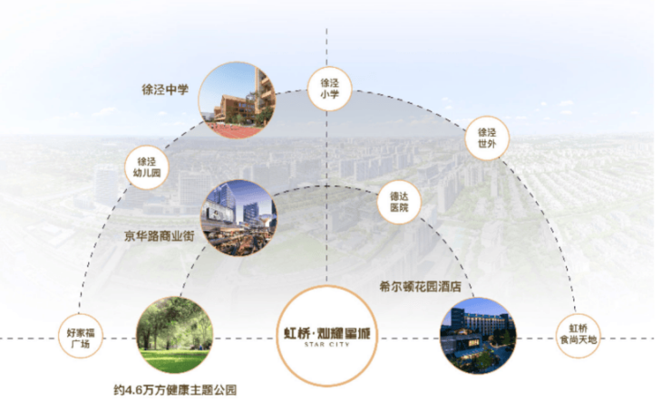 把“未来”变成“此刻”,灿耀星城以十年全景兑现生活想象,联动片区擘启百万方级城市生活新图景。约9万方自持商业,一街之隔即达虹桥食尚天地、好家福广场、京华路商业街等,与希尔顿品牌酒店集群形成黄金生活圈,下楼即享24小时醇熟繁华;社区配建的幼儿园与徐泾中小学、青浦世外等学府串联成全龄教育链;德达医院、冬雷医院及远大健康城,以多元化医疗资源默默筑起健康屏障。“生活-消费-教育”的15分钟闭环,重新定义大城生活的高阶标准。