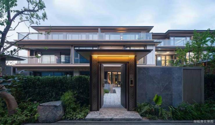 以“宋代官帽”形制打造34米宽4.5米高的迎宾门厅,给予归家仪式感;从中国传统金镶玉的工艺手法中汲取设计灵感,与玻璃相辅相成,营造美学立面;型制上保留了三段式+坡屋顶的比例关系,通过“三重檐”结构,再现东方屋檐之美。