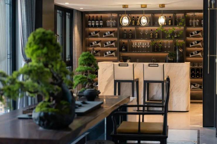 门窗、影壁、屋顶等经典中式型材与凯撒灰石材等创新中式型材巧妙融合,使得建筑整体仿若高冠博带的雅仕,踏风而来、明朗雅逸。枫、松、红梅、鸿运果等颇具中式特色的盆景,虚实相映,沿途比比皆是,生活鉴赏家们感受着古今人居美学的相融相生,触摸着由真材实料勾勒而成的建筑中,所蕴含着的匠心之美。