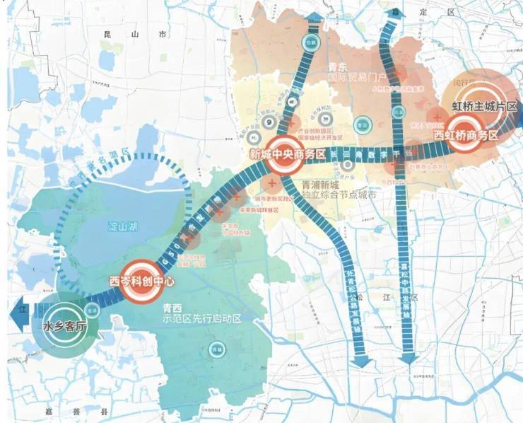 “东翼”包含西虹桥商务区和赵巷商业商务区;“西翼”由环淀山湖经济圈为;