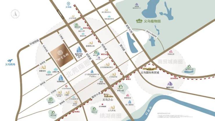 坐拥环城西路、机场路、丹溪北路纵横路网,车行约10分钟直达义乌之心、义乌天地等商业中心;车行约15分钟畅达国际商贸城、福田CBD,执掌事业与生活的双重主场。
