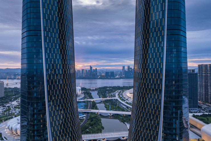 建筑以杭州拼音首字母"H"为造型灵感,融合西湖"双峰插云"意境及拱宸桥元素,双塔通过跨度60米的悬垂连廊衔接,倒影形成"江南园林拱门"意象,获2024年CTBUH全球高层建筑奖