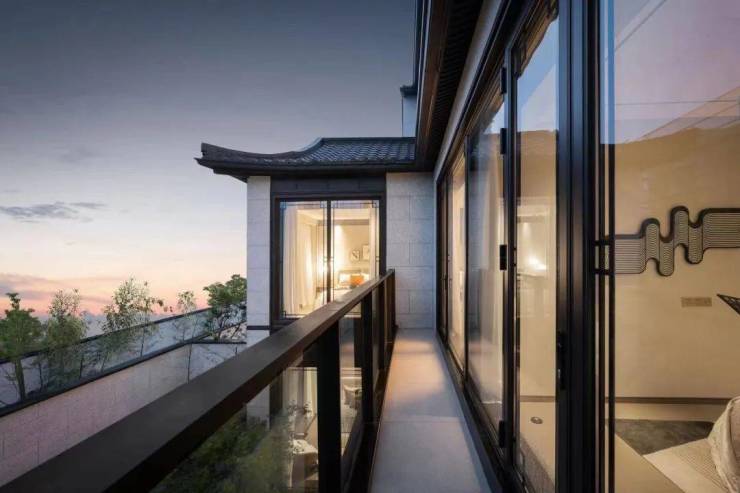 浅色石材的外立面上盖日式合瓦屋面,搭配深色金属构件,使得色彩构成冷暖有机结合,典雅简约,呈现出有时代气息的新中式建筑。歇山、硬山和小披檐等手法,丰富了建筑造型与建筑空间,与周围依山傍水的环境完美融合,组成了一幅幅画家笔下江南水乡静谧风雅的生活画卷。