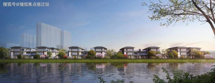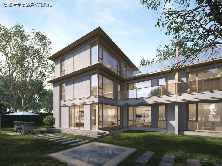 注重让建筑融入自然,回归生活,建筑外立面采用大面积玻璃、局部干挂石材,屋顶采用宋韵坡屋顶+批檐,金色不锈钢玻璃窗框,打造现代中式风格,以温暖的东方美学建筑迭新富春的居住审美。