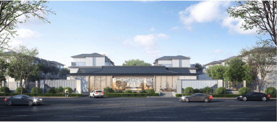 大面积玻璃、局部干挂石材,屋顶采用宋韵坡屋顶+批檐,打造现代中式风格