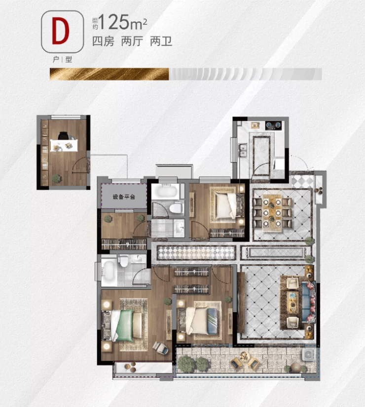 最后再看建面约125㎡四室两厅两卫户型,在布局设计上更加彰显功力,简直是改善一族的首选。