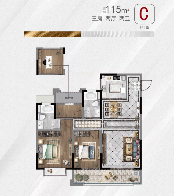 再看建面约115㎡三室两厅两卫户型,同样三开间朝南的方正格局,增加整体户型采光面,南向达15㎡的主卧套房设计,衣帽空间+独立洗手间+景观飘窗,尊崇感、私密感满满。