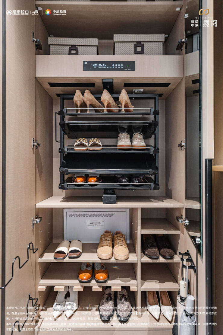 进门后可随手放置雨伞、钥匙等外出用品,旋转鞋架、消毒精灵等丰富细节,足以打动每一个收纳达人的心。
