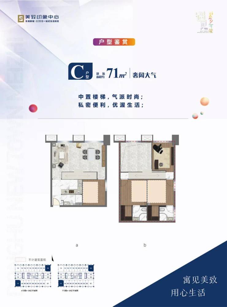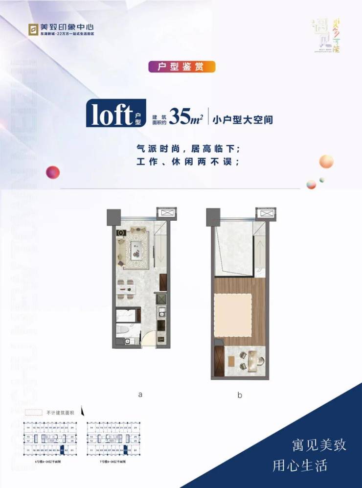 在美致印象中心,您可以选择多种户型,面积从约35-71平方米不等。特别推荐的是我们的双门双钥匙和Loft户型,既适合居住也适合投资。房屋层高达到4.78米,为您提供宽敞舒适的生活空间。价格方面,总价从54.5万起,精装交付,您只需拎包即可入住。