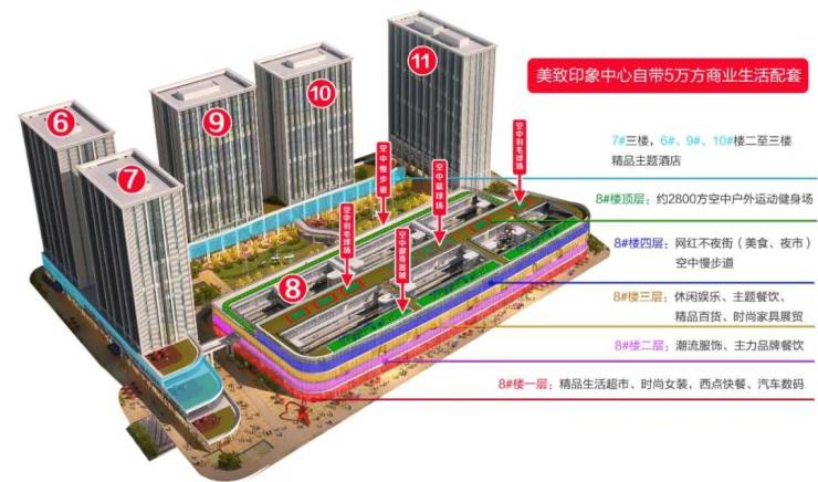 为了满足您的日常需求,美致印象中心还自带了一个5万平方米的商业综合体,集购物、餐饮、娱乐等多功能于一体,让您的生活更加丰富多彩。