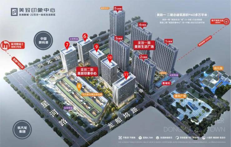 美致印象中心位于杭州市临平区国家级经济技术开发区的核心位置,坐落在星河路与兴元路的交汇处。这片占地约132亩的综合性项目,总建筑面积超过40万平方米,而其中我们的美致印象中心就占据了22万平方米。它由6幢建筑组成,包括5幢20层的点板式LOFT公寓和一座4层的综合商业街区。