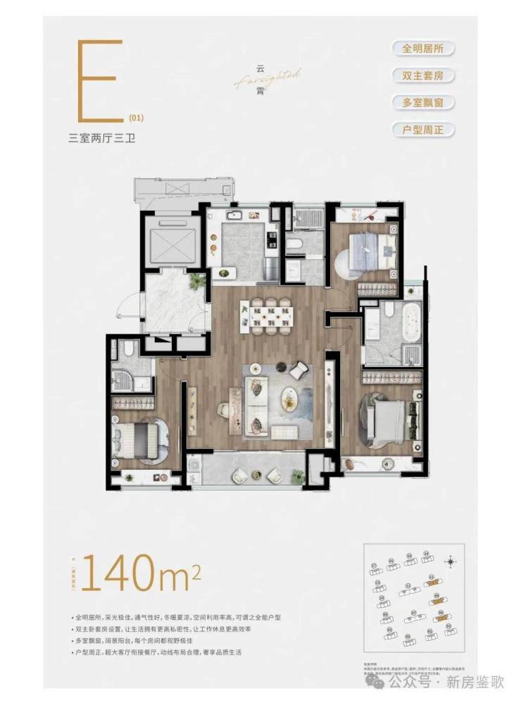 - **主卧套房+干湿分离**:独立卫浴、步入式衣帽间及飘窗设计,兼顾私密性与舒适体验。