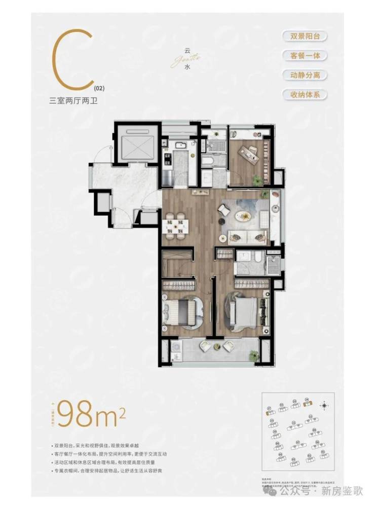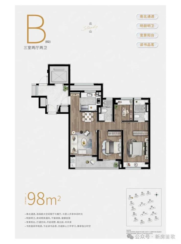 - **约98㎡3+X户型**:灵活可变空间,可改造为衣帽间、儿童活动区或电竞房,提升实用性。