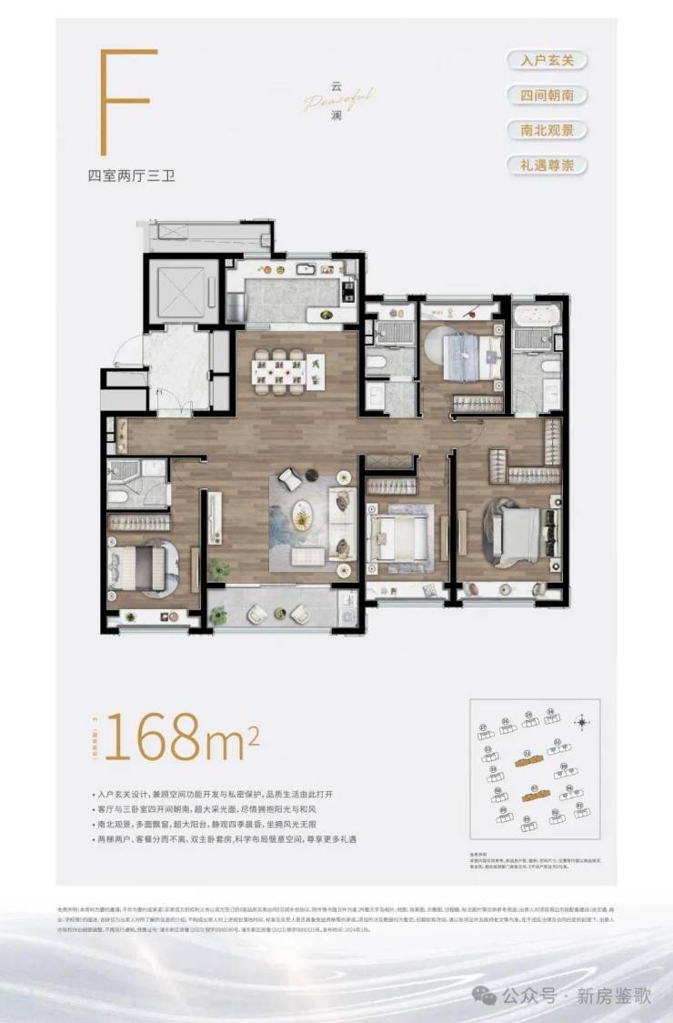 项目主力户型为建面约89-168㎡的3-4房,**得房率高达80%-82%**(远超同级别项目73%的平均水平)。以168㎡户型为例,实际使用面积达137㎡,层高3.15米,搭配南向四面宽设计,空间通透感与舒适度远超预期。