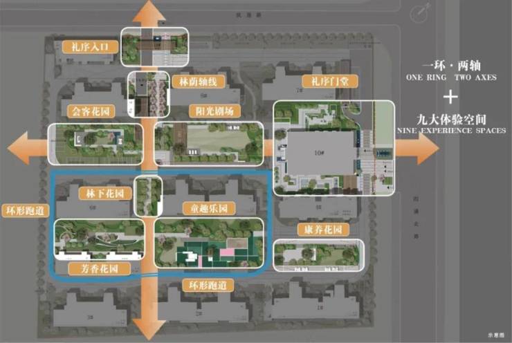 九大空间:礼序门堂、礼序入口、林荫轴线、阳光剧场、会客花园、林下花园、童趣乐园、芳香花园、康养花园