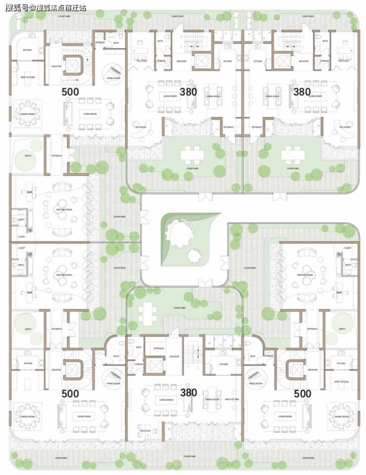 别墅面积段大概在380-500㎡,组合形式不同于市面上常见的联排、双拼。而是一种围绕中心/社交景观,呈围合式布局的创新方式。