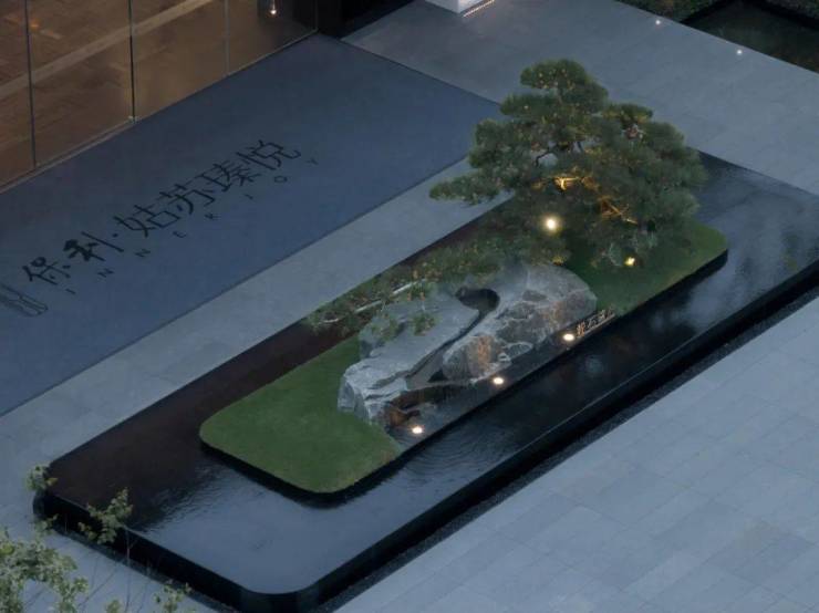 第一幅通过景墙的框景,使人们的注意力集中在中心的景观上,一松,一石,一池水便是画卷,文石水墨、无边静水,寓山于水,一静一动,动静之间又有无限深意,如《姑苏繁华图》中的一处缩影,松石相望,流水相伴;入口设置了三步台阶寓意:云接三级,步步高升,此外营造了两幅长卷画面。