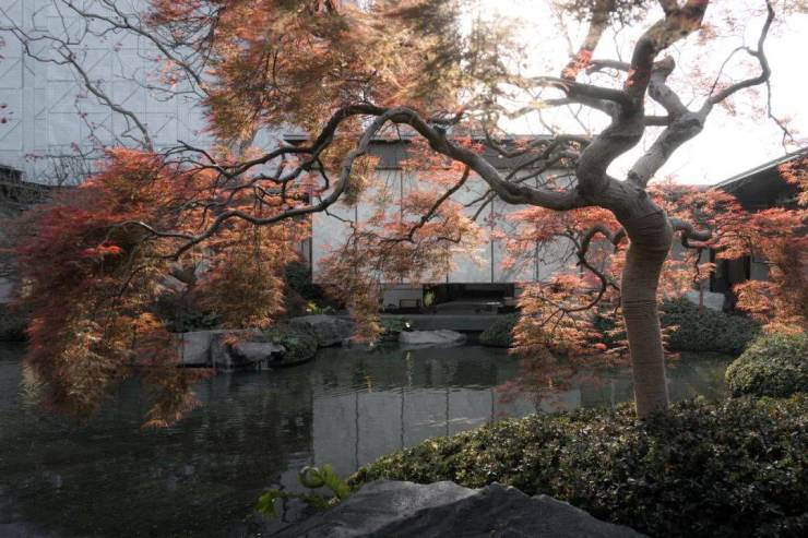 第二幅画框,透过松枝和玻璃的障景可以隐约看见山水隐园的景色,影影绰绰,前景的松石如同屏风,欲扬先抑,增加层次。