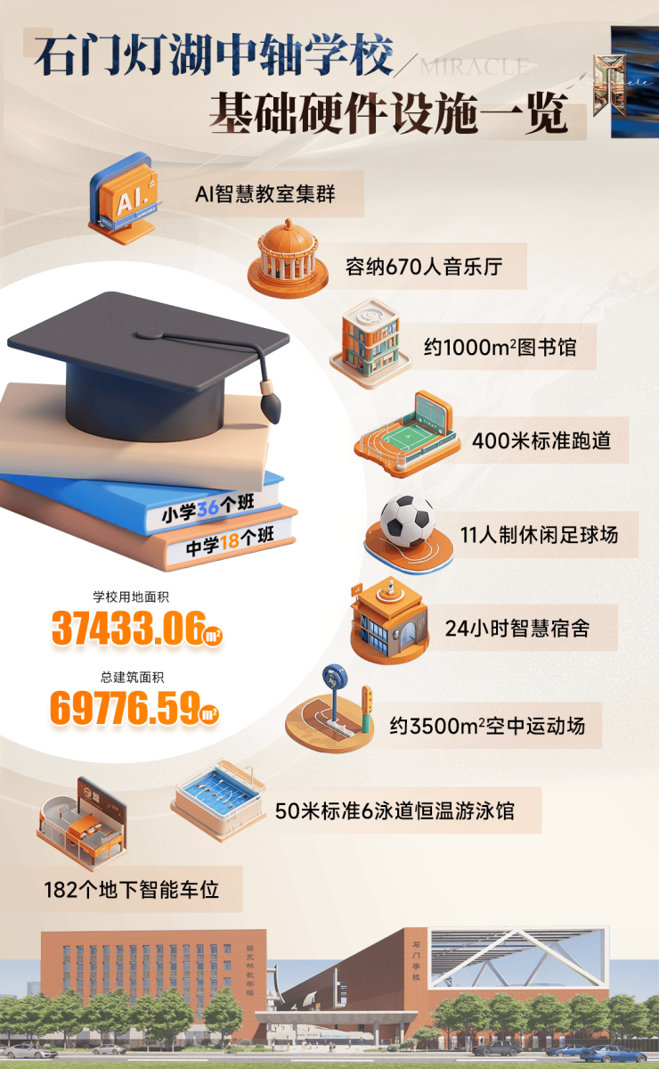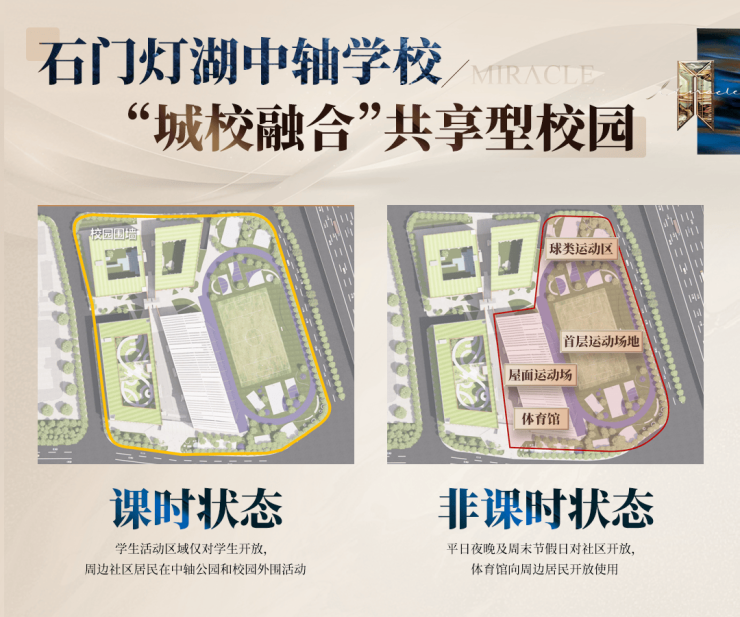 更棒的是,石门灯湖中轴学校将打造“城校融合”的共享型校园,校园将分为课时状态与非课时状态,平日夜晚及周末节假日,运动场地将面向社区居民开放。