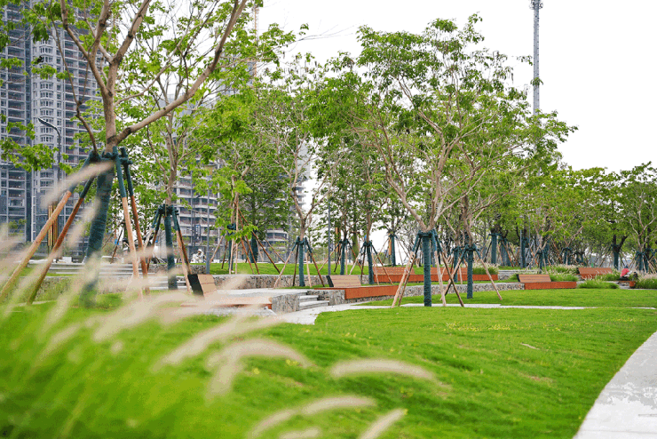 临江步道模拟溪流的轨迹,奔跑其上,与绿树清风并肩而行,感受自然最温柔的轻抚。