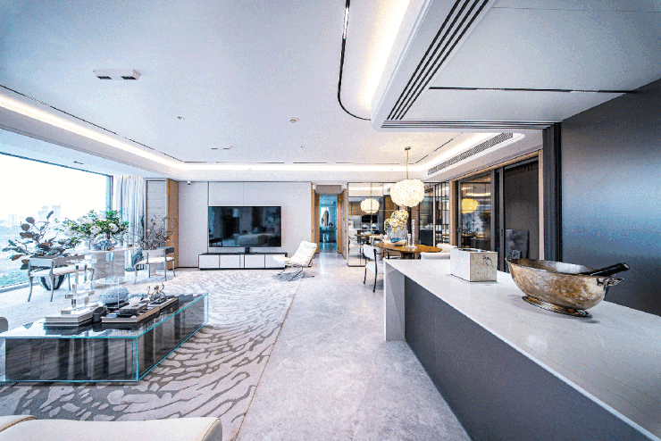 客餐厅、阳台与厨房这几个核心功能区衔接互通,消除了空间的隔阂感,形成了一个无柱化社交场域,超尺空间与一线江岸的组合,创造出无与伦比的通透性。