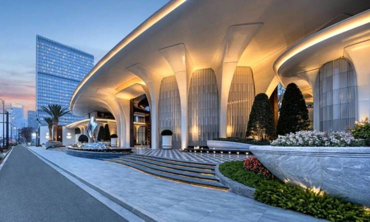 元序的产品力,是那种你第一眼看到就会“哇”出来的存在。宽超百米、高约11米的阔尺门廊,月白奢石与透光云石吊顶交织光影,归家的第一重仪式感就被拉满。