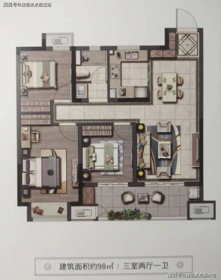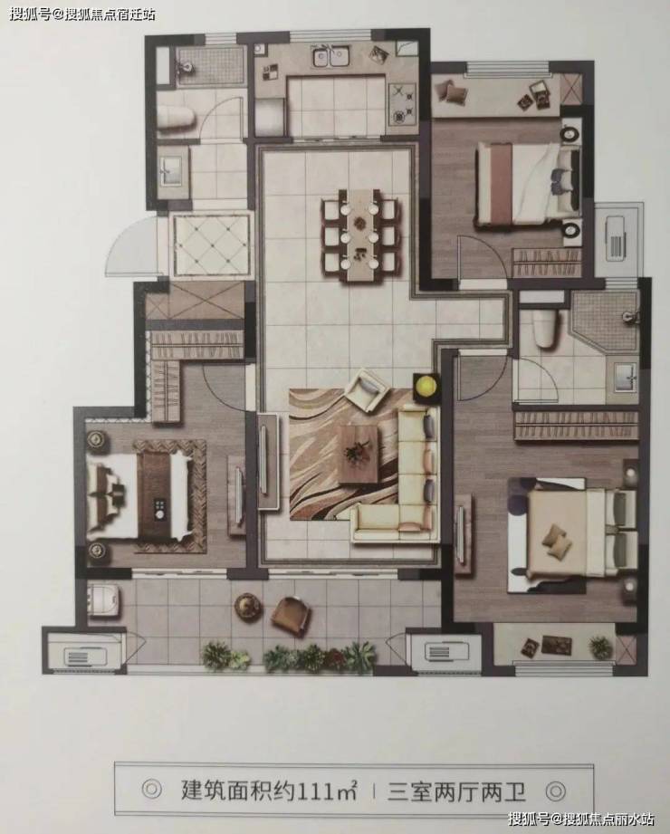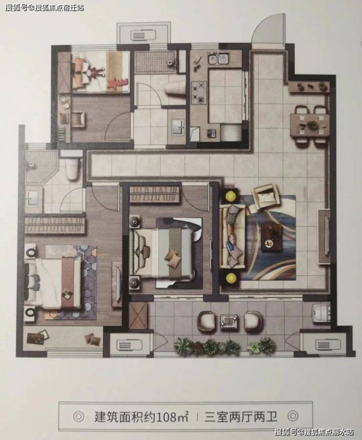 建面约108㎡,三室两厅两卫:主卧套房设计,不过次卧面积相对较小,当书房或儿童房比较合适。