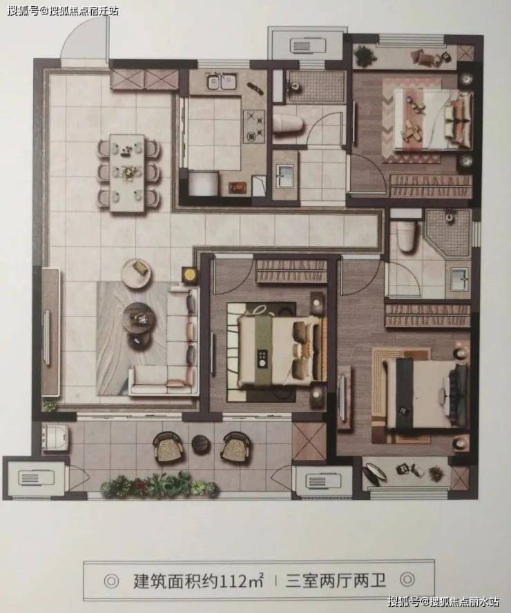 建面约112㎡,三室两厅两卫:三开间朝南的方正户型,在98㎡户型的基础上增加了主卫,客厅面宽也更大。