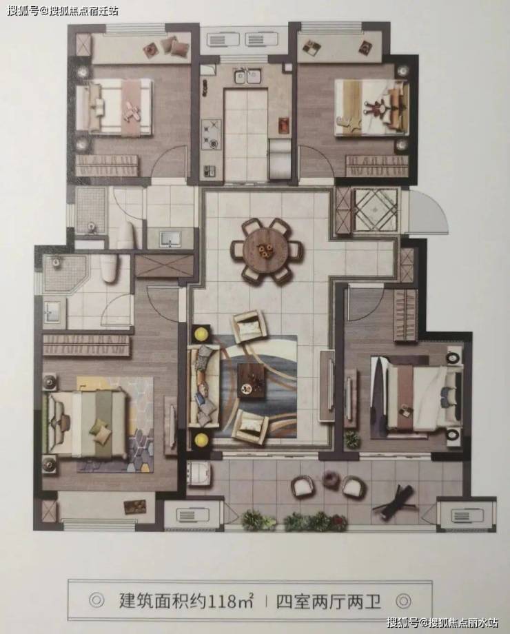建面约118㎡,四室两厅两卫:四叶草户型,与111㎡相比虽然面积相差不大,但多出一个房间,两孩家庭有需要的可以优先考虑。