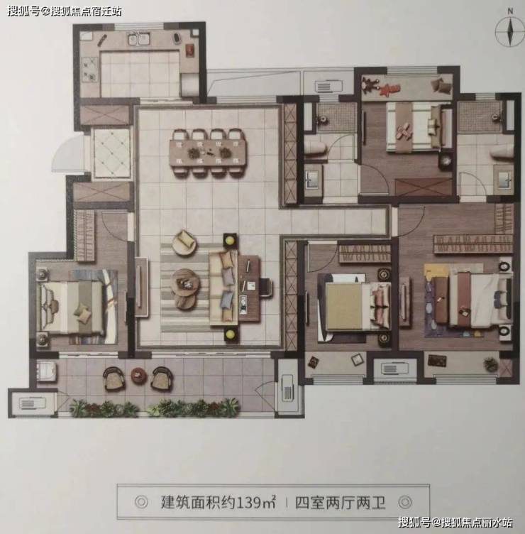 建面约139㎡,四室两厅两卫:大面宽短进深,入户左右双玄关,三个卧室都带有飘窗,大面积的方厅也让日常活动更加自如,改善家庭首选。