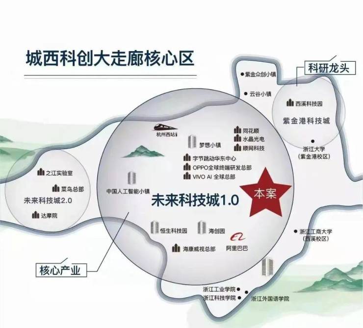 未来科技城是城西科创大走廊的核心区域,是中国四大未来科技城之一,中国硅谷。截止2020年底拥有上市公司300余家,落户企业超2.5万家,包括阿里巴巴全球总部、字节跳动、VIVO全球Al总部、OPPO全球终端总部等高能级名企林立。众多产业云集带动巨大的人口红利,其中以"阿里系、浙大系、浙商系、海归系",四大新四军为主的全球精英汇聚在此。