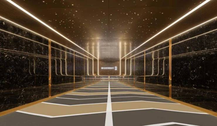 来到45米宽,18米进深的大门,这样的尺度感放在全国的同类项目中也不多见,意大利芬迪黑石材与普拉达绿奢石结合,走进西投银泰城│映萃的大门,仿佛来到一座高奢度假酒店的大堂。