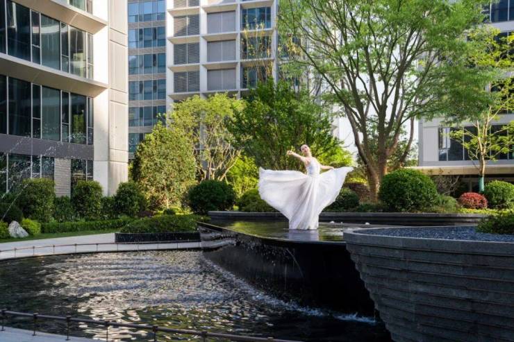 园区内,镜面的水庭倒映出天光云影,从水溪到中心水景,搭配铁冬青、银海枣、娜塔栎等名贵树种做成的亚热带景观园林,在媒体品鉴日的现场,不少媒体同行拍照打卡说,在这里拍照打卡,就像在三亚的嘉佩乐酒店度假一样,羡慕未来映萃,每天都住在度假酒店里……