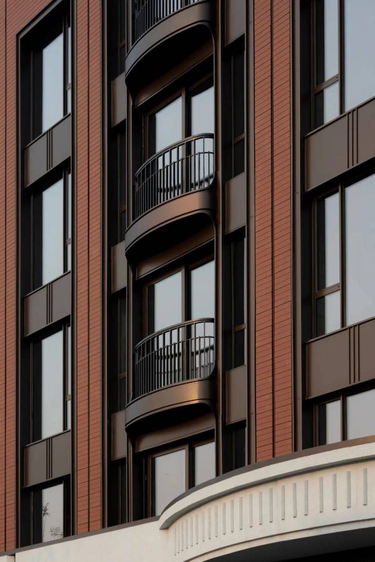 红砖的温润与金属的冷冽交织,光影在繁复而精致的立面上流转。