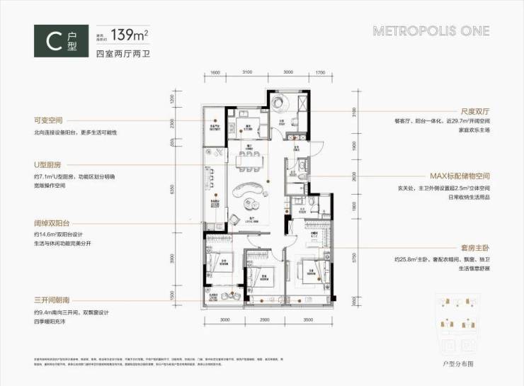 约139平方米的户型则展示了对生活品质的追求,宽敞的大厅设计让居室显得开阔,双阳台和双飘窗的设计巧妙地分隔了生活与休闲区。这样的环境使得每天的居住都成为享受。4室2厅2卫餐客厅阳台一体化,近约29.7㎡开阔空间,9.4m南向三开间,双飘窗设计约25.8㎡套房式主卧奢华衣帽间