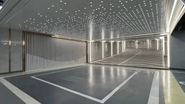 进入地库,简奢典雅的浅灰色基调,搭配深咖色的格栅吊顶,气派开阔、奢适明朗的空间感扑面而来。加之车位和车道的全精磨地坪,让整个地面的光洁度更高,在吊顶灯带的辉映下,更显豁达明朗的尊崇感,营造出一个有温度、有品位的泊车空间。