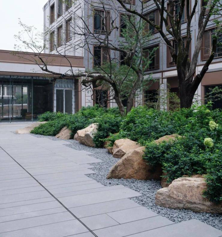 景观因此变得有机而生动,如同自然在轻声回应。石的坚毅与植的柔美相互依托,使空间在“刚与柔”、“理性与感性”之间不断转换。