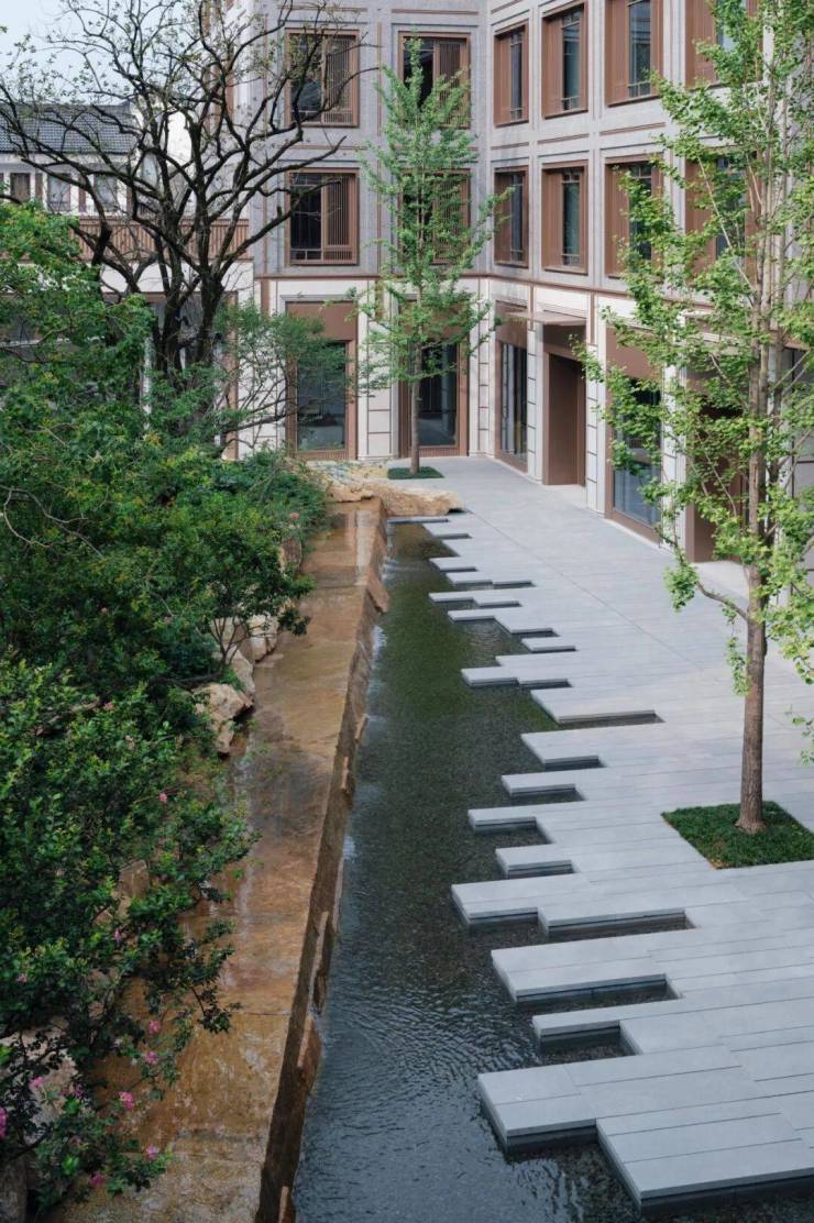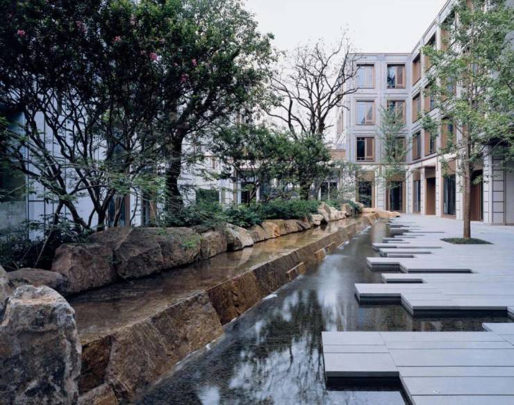 空间的一侧,以硬朗的石材与直立的银杏,构筑出一种当代的节奏,简练而清晰,如同城市的另一种延伸。另一侧则悄然转换为自然的场景,绿意繁盛,枝叶相叠,氤氲着一种深远而宁静的气息。