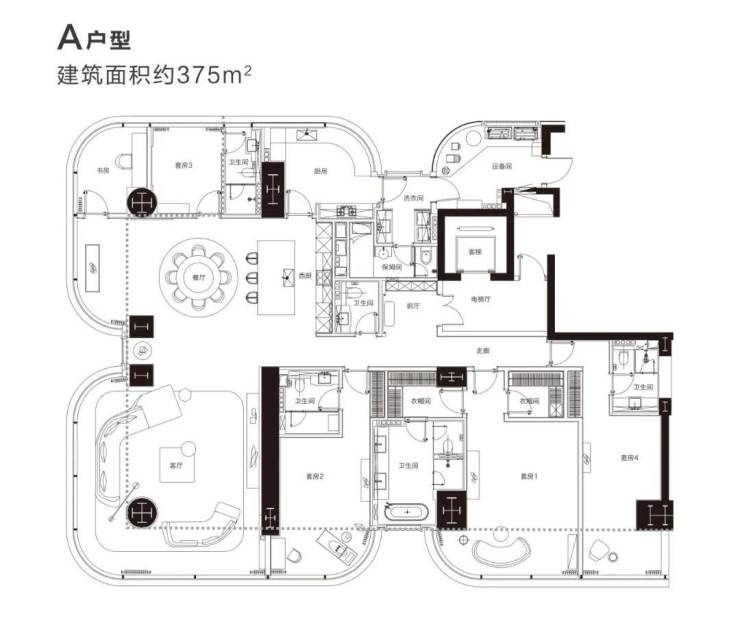 来自奢华酒店灵感的总统式四套房,提升家庭生活的私密感,尤其主卧空间,足以打造男女主人衣帽间、女主人化妆间。迈入主卫,超尺空间可安放巨型浴缸、高级台盆,仿如7星级酒店SPA空间,纵享身心的放松。