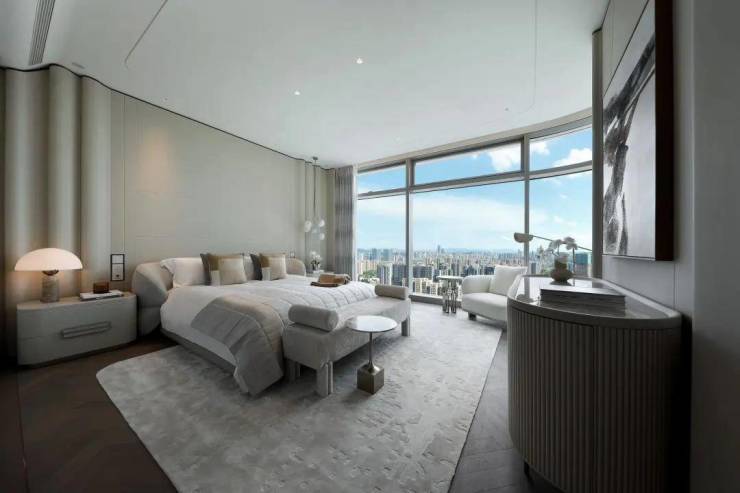 大尺度的高效利用,也让EIC大平层呈现出更多超越此前的空间享受。南向三个套房,24米的开间,停得下4辆加长林肯。进入主卧,罕见的主卫双开门设计,比一般人的主卧都要大,鱼肚白通顶,劳芬捷仕满配,甚至连公卫都是劳芬智能马桶,在这里泡澡,根本不用考虑窗帘。