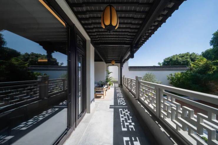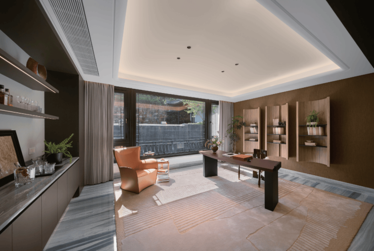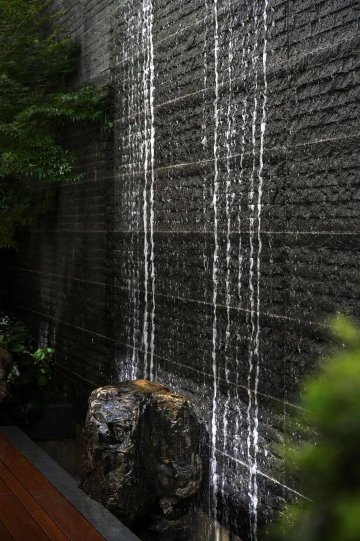 身为设计师的C女士钟爱11号院露台前的茶台,青瓷盏里的茶汤晃出青山的轮廓。“你看这飞檐的弧度,像极了宋画里的折枝,少一分则硬,多一分则赘。”眼底是对宋式审美的执念。白墙为纸,竹影为墨,湖山天境的东方合院将"留白"藏进每一处细节:格栅窗漏下的光斑随日光游走,水幕前的叠石藏着"一拳代山,一勺代水"的意趣。于她而言,收藏这里,是让生活住进千年东方的气韵里,不必言说,已是风骨。