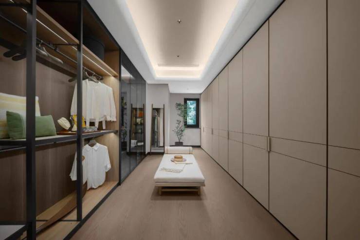 玄关旁的瑞族洗护一体衣物管家最懂生活——羊绒大衣刚脱下,一键就能护理得挺括如新;自己的定制西服第二天要穿,夜里处理好,清晨就带着阳光的干爽。Poliform衣柜的分区设计也贴心,衣饰配件,各有其位。"未来住进来,也不必担心「代际间的审美打架」——这才是真正的“一劳永逸”,把精力还给生活本身。