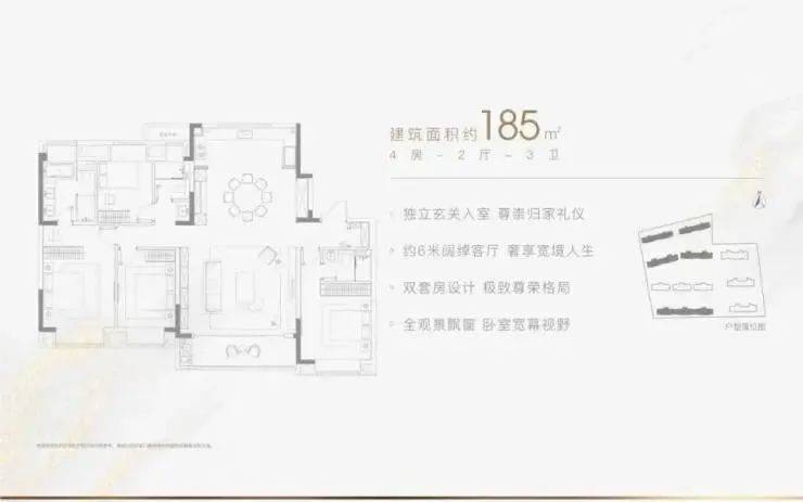 三个户型均预留入户外玄关空间,可以外置雨伞、鞋柜、置物架;四开间朝南,整个户型通透明亮;LDKB一体化设计,厨房、餐厅、客厅、阳台均位于同一动线上,拓展了活动区域的实用面积,轻松满足家庭聚会需求;打造有品味的起居空间,双套主卧套间设计,其中185㎡&218㎡,主卫更采用酒店式双台盆和大浴缸设计,只为生活更加舒适。