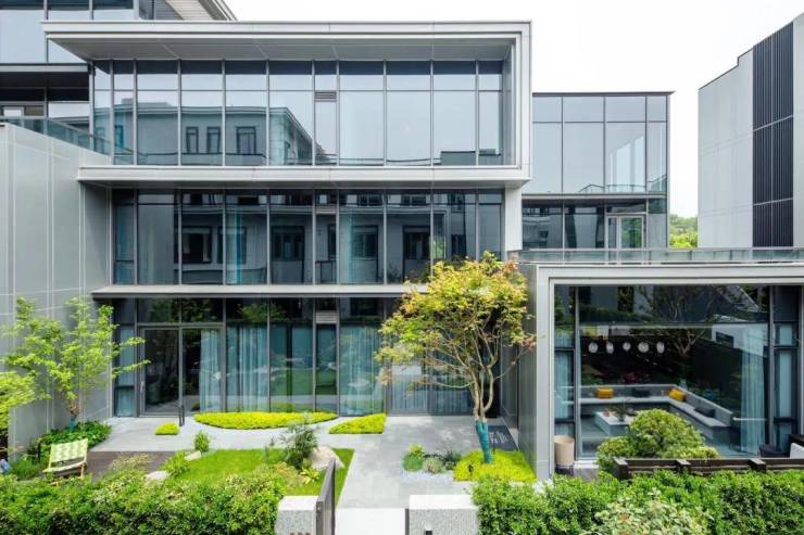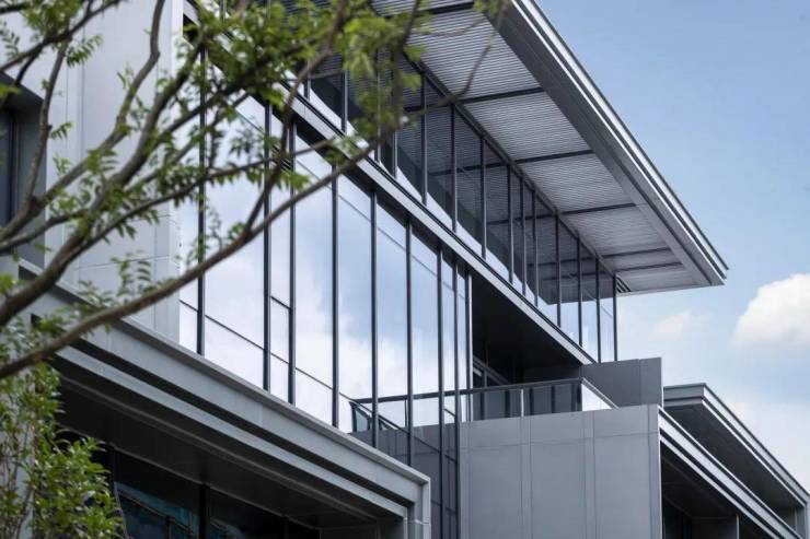 大面积玻璃幕墙与灰系铝板,最大约26米超级面宽,以极简主义对标国际审美。