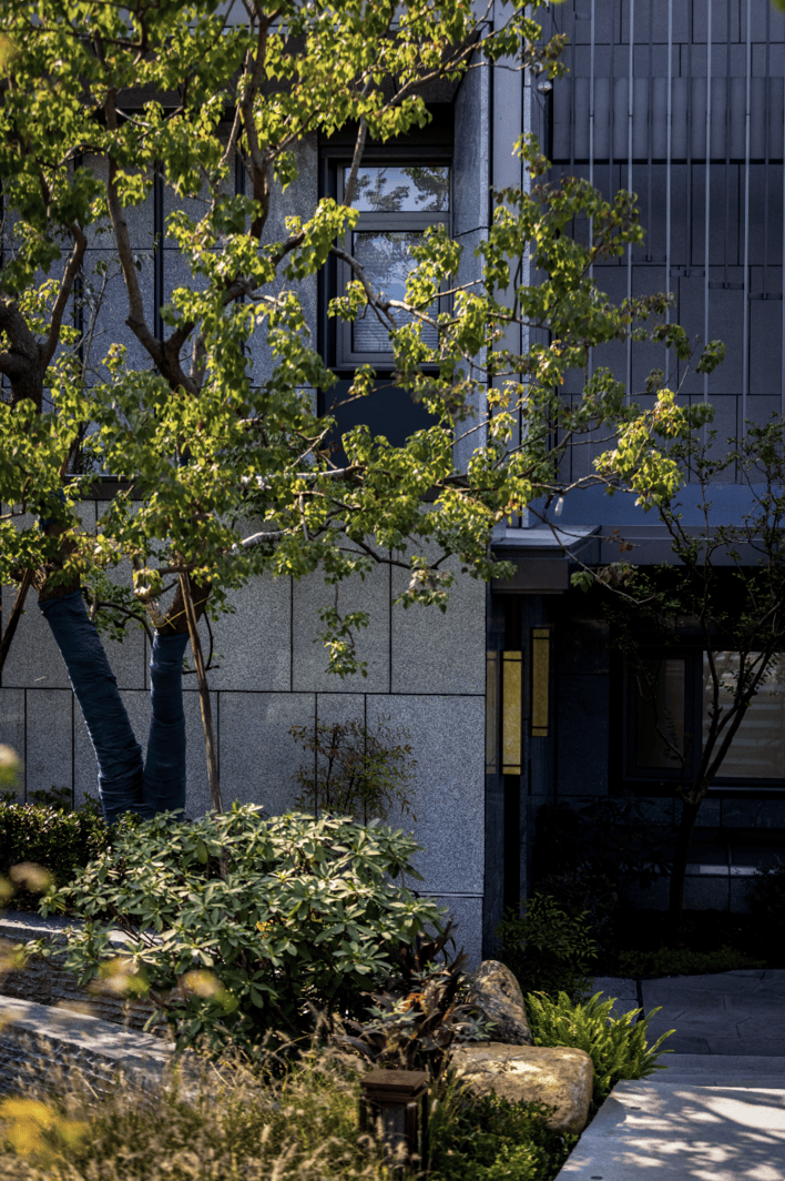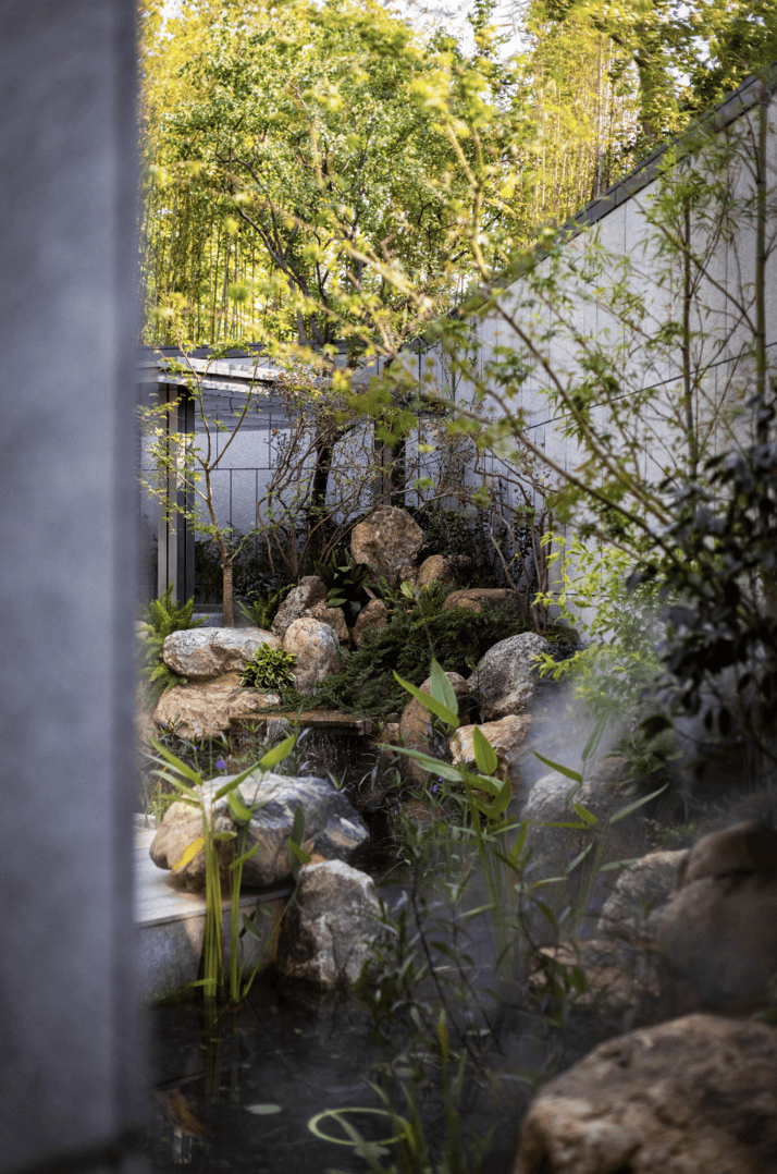 在设计师巧妙运作之下,24 席院落被诗意与绿意层层包裹起来。由东方园林提炼而来的造“静”八法, 将“一园一苑两街四巷 24 院”与“三进三出”的东方礼仪有序铺陈,里弄与街巷交织、庭院与軒榭辉映; 院落空间里,云岭、山谷、溪瀑及深林等意象被邀请进来,皆得到诗情画意的表达,院里藏山水、院外品西溪,一幅里外皆风景的都市生活画卷,在此启封。