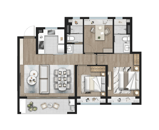 3.5开间的南向户型,除了主次卧朝南,更进一步将客厅的开间加宽,成为一个横厅。横向宽厅的好处是可以有更多的南向采光,阳光更充足。此外,客厅可以弹性软分隔的方式,分出一个开放式书桌的空间,适配更长的家庭周期。