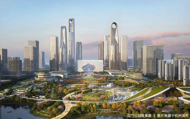 云门公园(在建中)占地约100公顷,约等于钱江世纪城公园和运河亚运公园之和。南区串联起了文化谷、乐潮谷、创智谷等绿色生态中轴线。北区则是体育公园、科创会议中心等建筑群,将会成为杭州又一综合性地标。