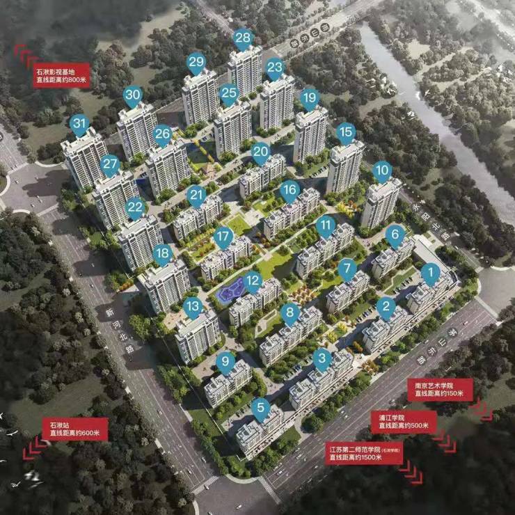雅居乐星汇天际位于溧水区石湫科教城,靠近地铁S9号线石湫站,周边汇集了石湫中心幼儿园、石湫中心小学、桑元浦小学、溧水石湫中学等教育资源。项目定位为雅居乐南京首个轻盈住区,小区体量较大,共规划28栋高层(20F)及45栋低密度多层住宅产品(6-9F),主力户型建面约88、100、110㎡,带装修交付,由雅生活物业管理服务。